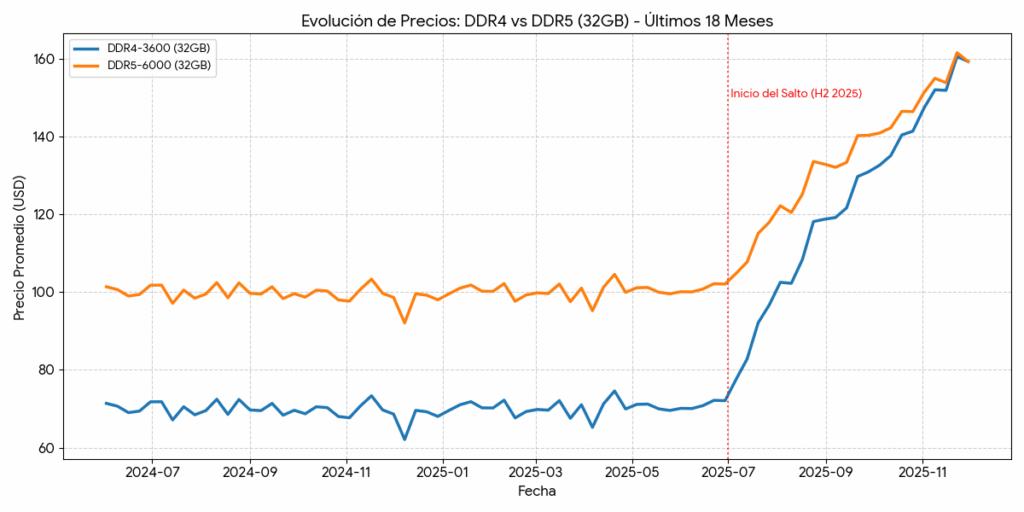 Durante 2025, los aumentos de precio han sido escandalosos. En algunos mercados, kits DDR5 de 32 GB han experimentado incrementos entre 163 % y 619 % desde septiembre.